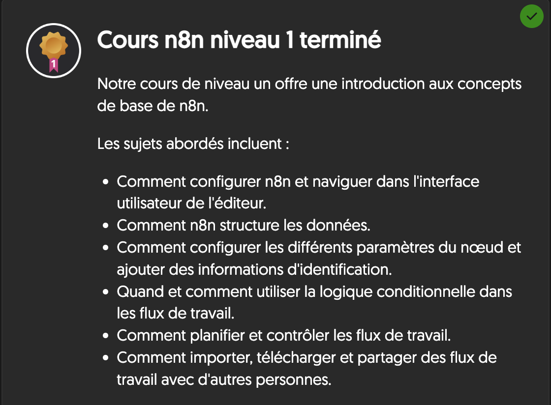 Notre cours de niveau un offre une introduction aux concepts de base de n8n.